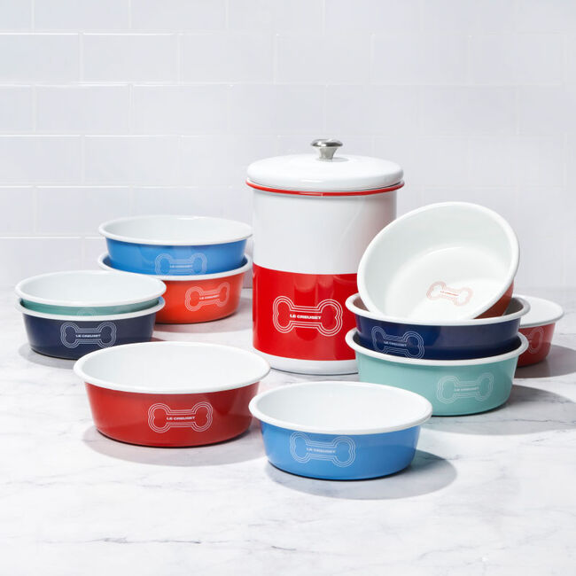 Crafted from human-grade carbon steel, the jar has a generous 4 1/4 quart capacity that is paw-fect for storing kibble and tasty treats. It’s finished with a colorful glaze and Le Creuset's iconic three rings in a fetching dog bone design, and topped with a signature stainless steel knob that coordinates with other Le Creuset cookware. As dependable as your best friend, the enamel coating is hygienic, easy to clean, and resistant to chips, stains, scratches and rust. Bone appétit!